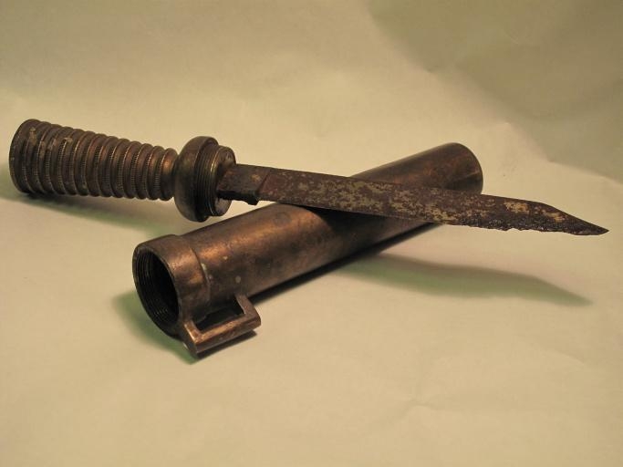 Ásamt tilheyrandi slíðurshólki. Hnífurinn tilheyrir kafarabúningi sem Vélsmiðja Seyðisfjarðar átti. Notaður við vinnu kafarans, m.a. til að skera úr skrúfu. (búningurinn er á sýningu í Vjelasmiðju JH)