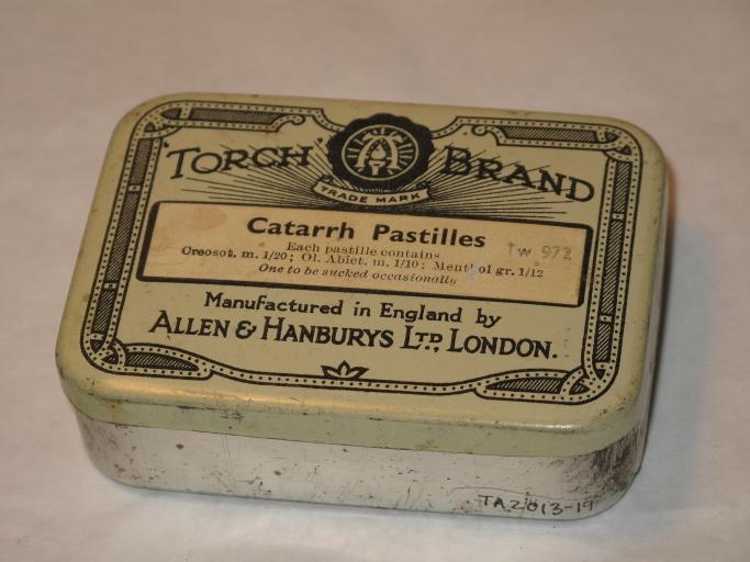 Askja undir hálstöflur. "Torch Brand Catarrh Pastilles". Vörumerkið var skrásett 1926 en Allen & hanburys hætti að vera til sem stakt fyritæki 1958.