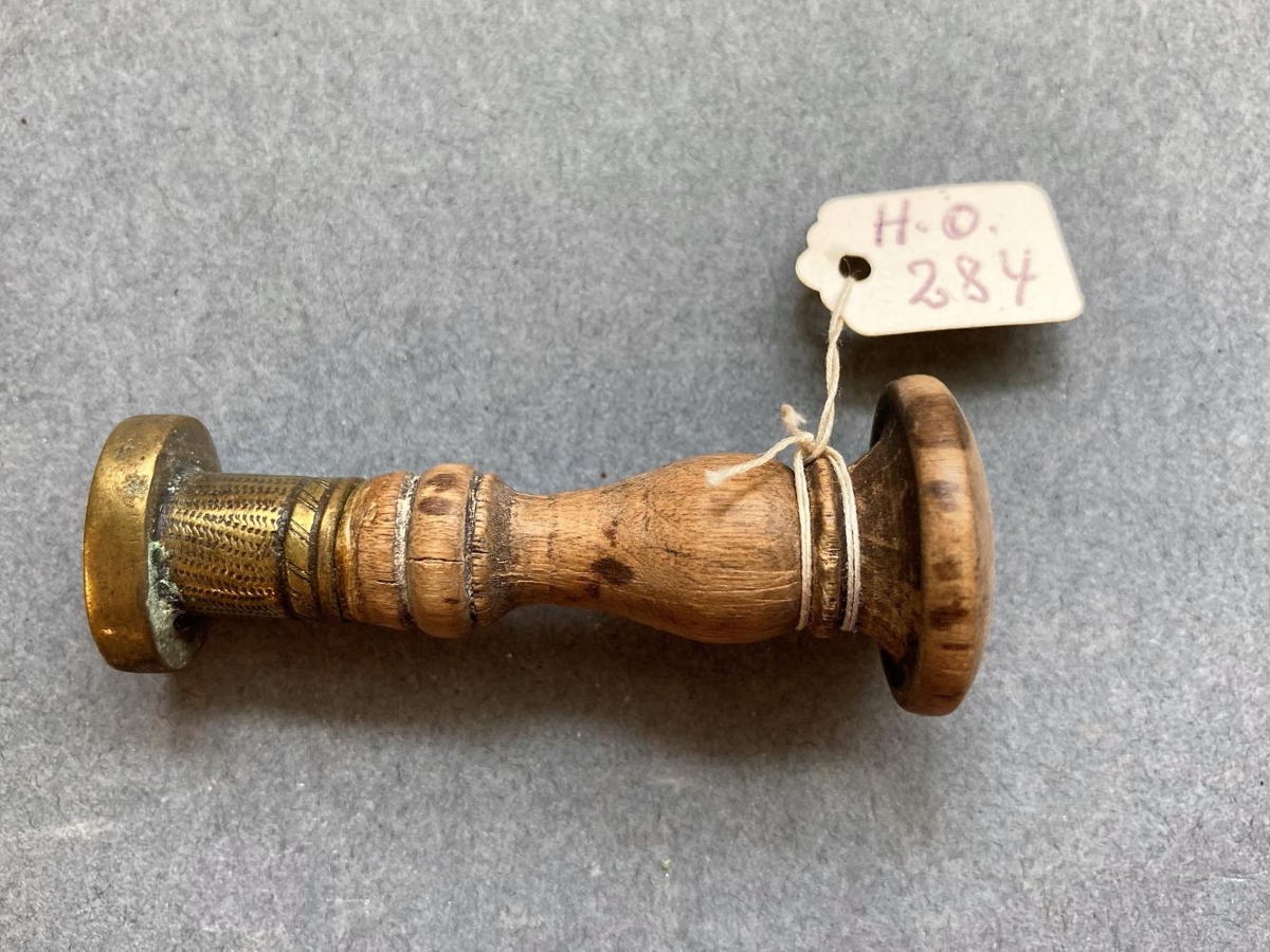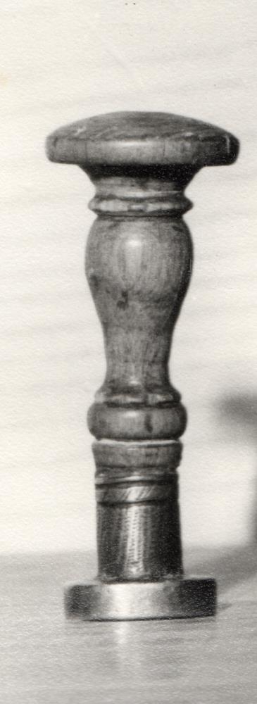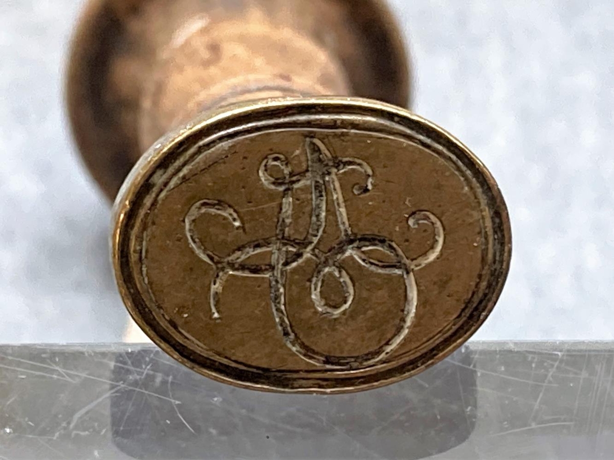 Signet, tréskaft, koparhaus. Á.J. hæð 5,6 cm. Átt hefur Ágúst Jónsson, f. 24.9. 1864, d. 22.1. 1934, frá Fljótsdal í Fljótshlíð. Gjöf frá tengdasyni hans Nóa Kristjánssyni Rvík. 17. 10. 1956.