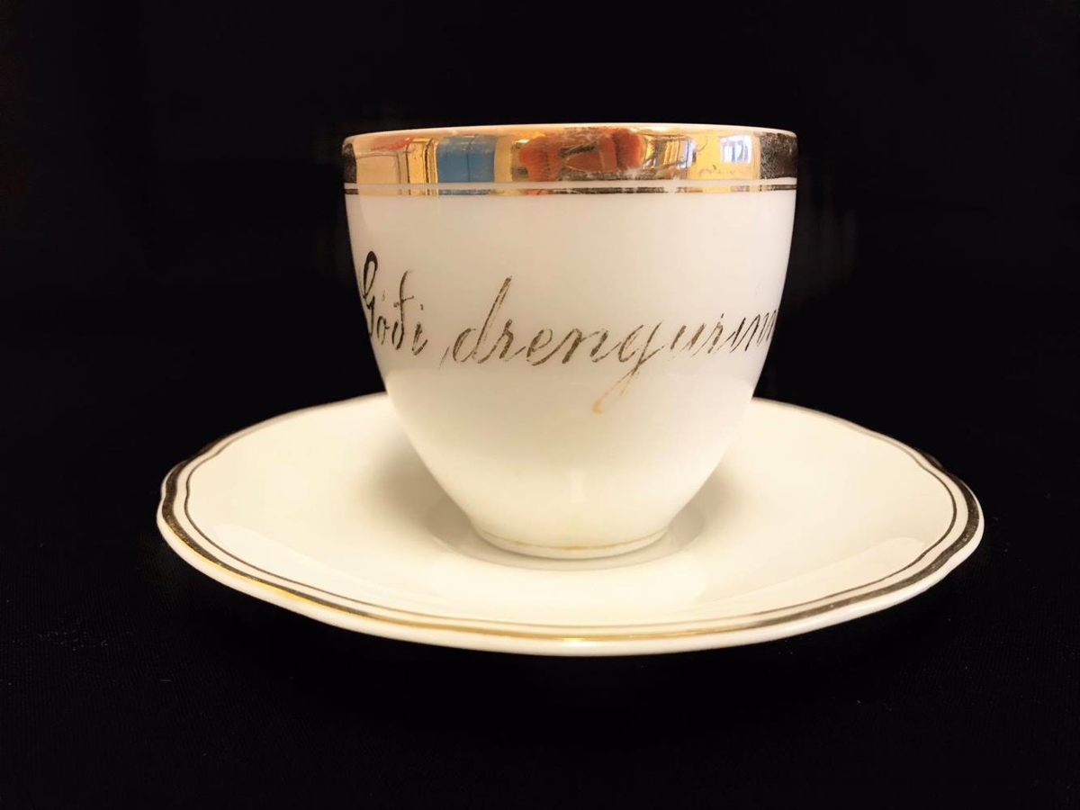 Hvítt bollapar út postulín með gylltri rönd með áletrun : Góði drengurinn.