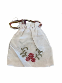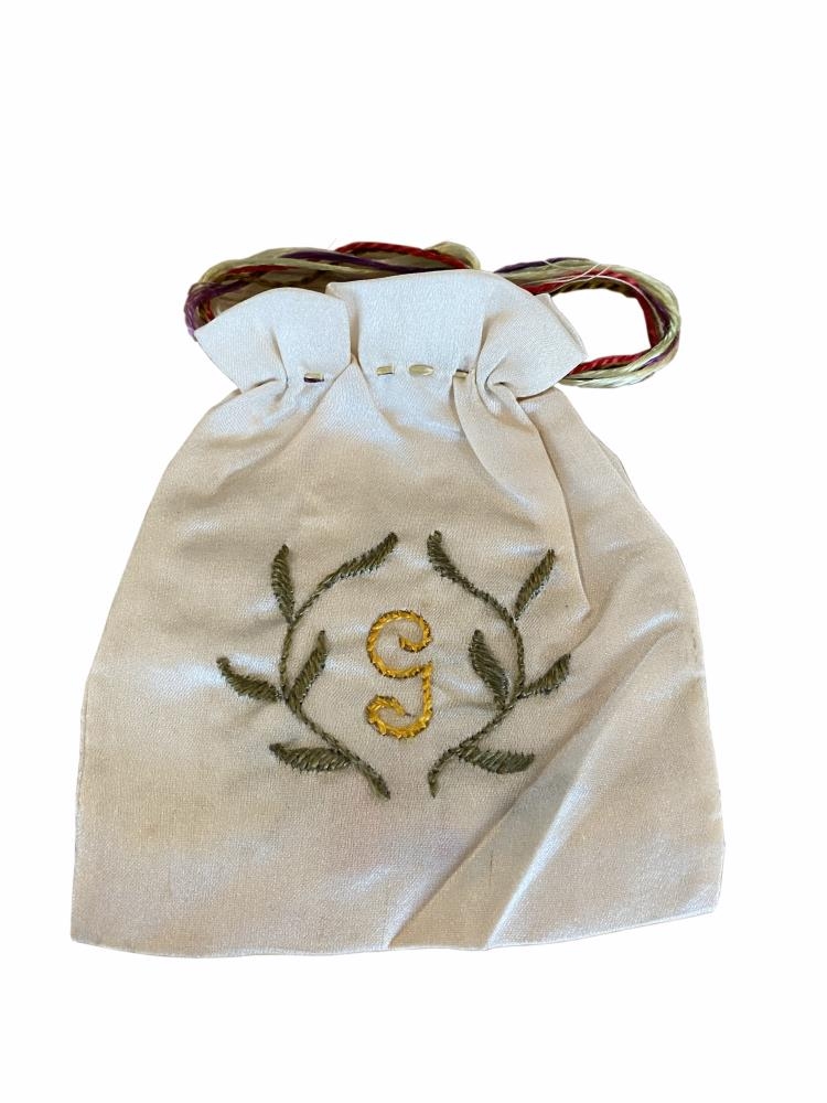 Öskupoki, útsaumur á báðum hliðum. Annars vegar bróderaður stafurinn G (Guðjón) og greinar í kring. Á hinni hliðinni lóm og greinar.