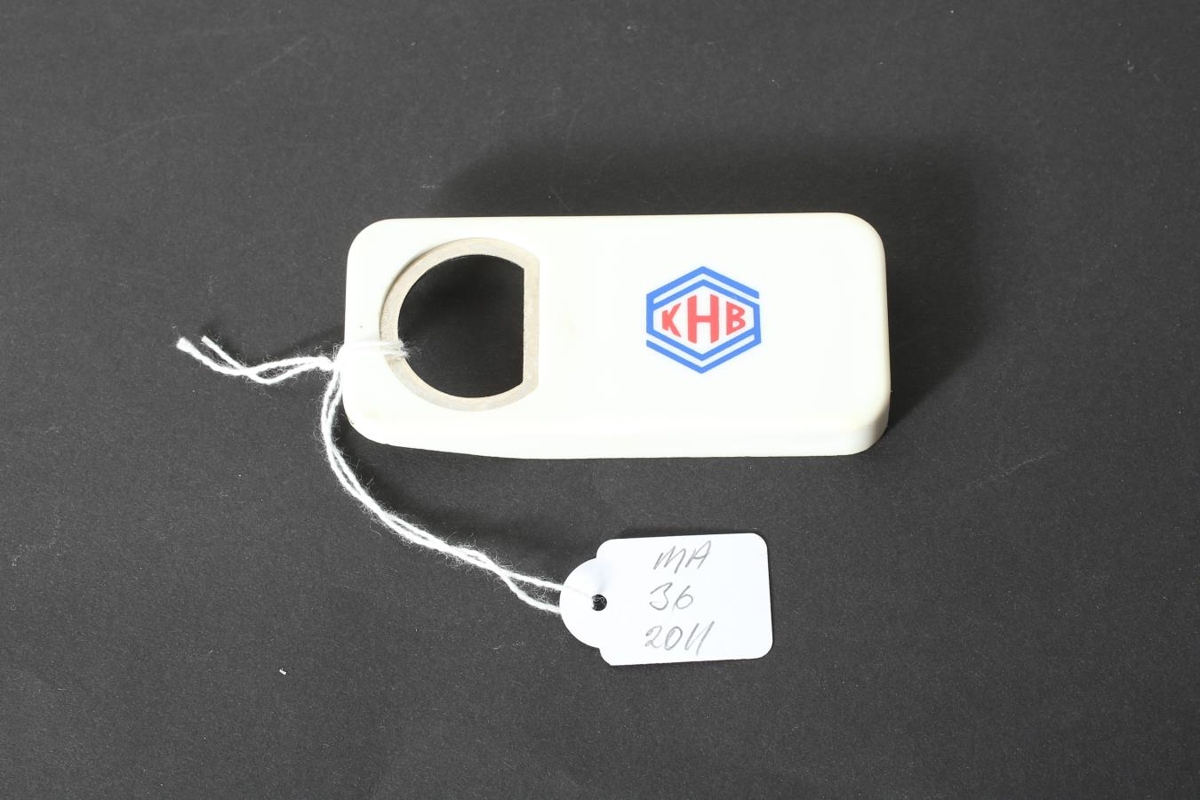 Hvítur, flatur upptakari með merki K.H.B. í bláu og rauðu. Framleiddur af Plastolan, Made in W. Germany. Var í eigu Ólafs Arasonar sem uppalinn var hér á Egilsstöðum.