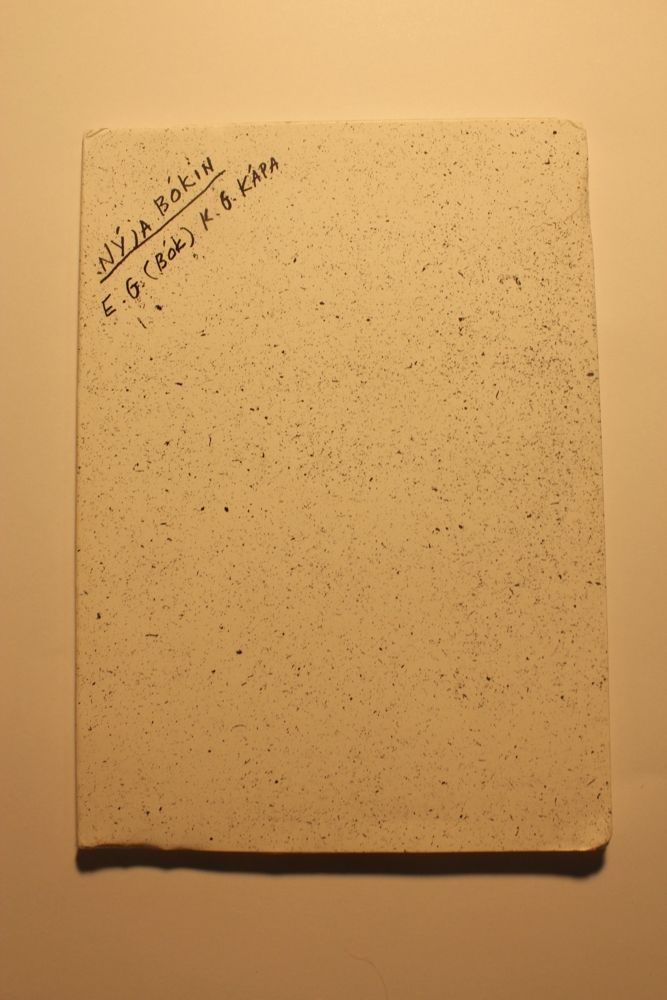 Ljóðabók. Hvít kápa með svörtum skellum, handskrifaður titill.