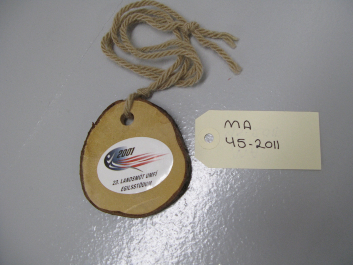 UÍA verðlaunapeningur úr viði. 23. landsmót UMFÍ, Egilsstöðum 2001.