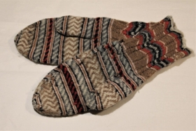 Kvenvettlingar með útprjóni í litum. Þel. Slitnir en halda sér vel. Einþumla. Verk Halldóru Oddsdóttur húsfreyju í Hjallanesi í Landsveit (1891-1971).
