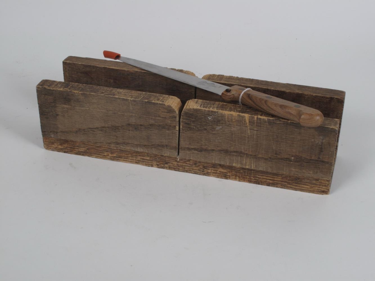 Hnífurinn er í stokk eða var notaður með þessum stokk sem er a.ö.l. heimasmíðaur úr timbri. Stokkurinn er 38 cm langur og 10 cm breiður og er hann með rauf fyrir miðju. Í sokkinn voru lagðar umbúðirs.s. bómull og hún skorin í ákveðnar lengjur og þá raufin notuð.