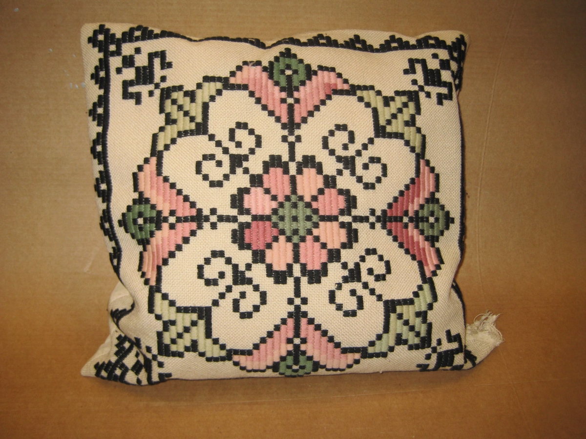 Ljós drapplitaður púði með útsaumuðu blómamynstri. Eitt hornið trosnað og komin gat svo að sér í fylliefnið.