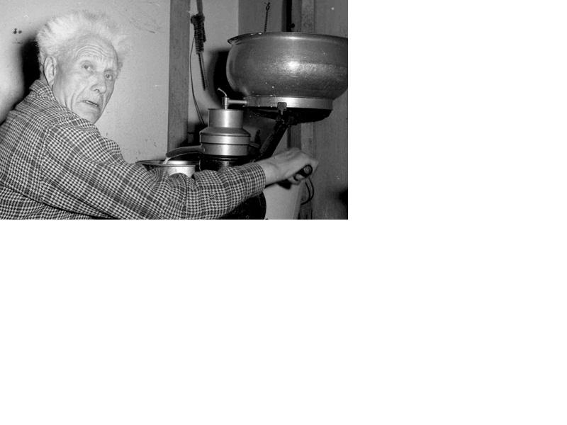 Gamall maður á köflóttri skyrtu að vinnu við skilvindu. Þetta er Jakob Guðmundsson vinnumaður á Húsafelli í Borgarfirði (1873-1963).