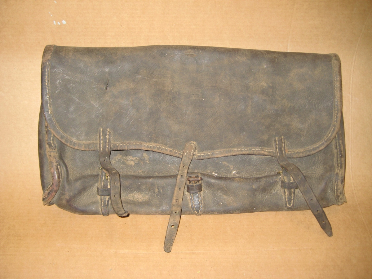Hnakk taska úr leðri. Þrjár festiólar til að loka. Slitin á köntum að neðan. Hefur verið mikið notuð.