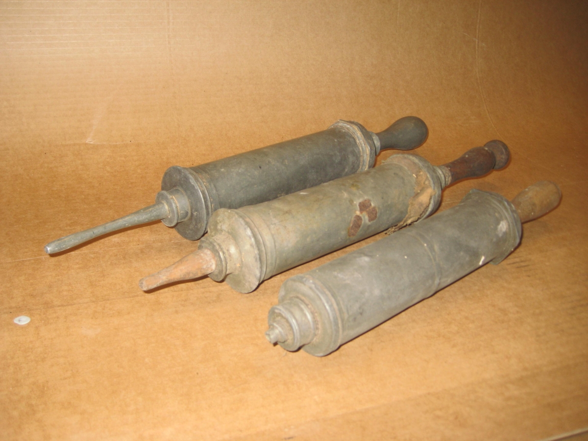 Þrjár stólpípur úr málmi. Tvær hafa handföng úr við. Ein er án stúts önnur með viðarstút og sú þriðja er öll úr málmi. Þær eru 35 - 40 cm langar og breidd þeirra er um 5 cm.