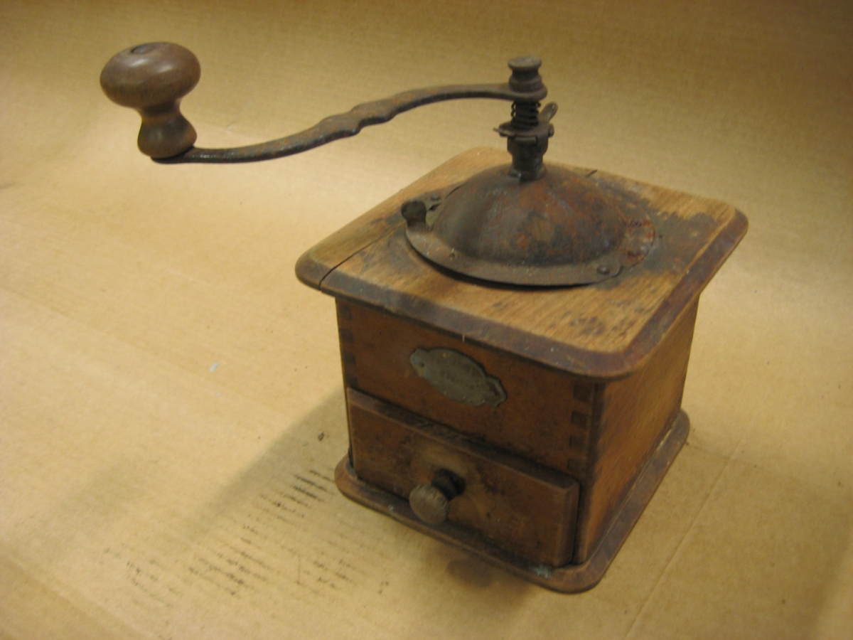 Kaffikvörn. Kassi er geirnelgdur með merki úr málmi á framhlið sem á stendur Leinbrocks Ideal D.R.G.M. árg. um 1910 skv. netleit.