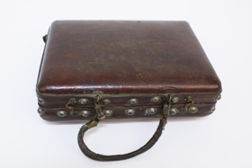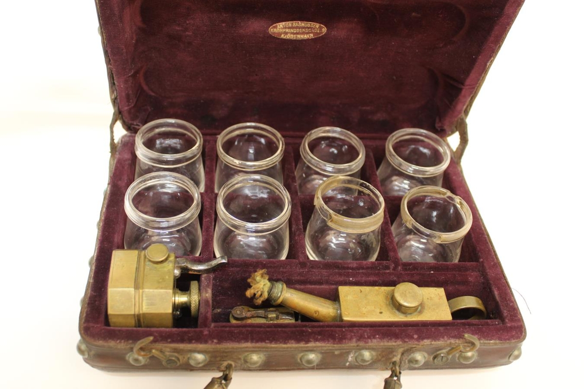 Blóðtökusett úr eigu Þórdísar Símonardóttur, ljósmóður. Taska úr leðri með koparhnoðum á hliðum. Taskan er fóðruð að innan með fjólubláu flaueli og merkt í loki „ANTON RASMUSSEN, KRONPRINDSENSGADE 9, KJÖBENHAVN.“ 8 sýnaglös úr gleri eru í töskunni ásamt 3 öðrum tilheyrandi áhöldum úr messing.