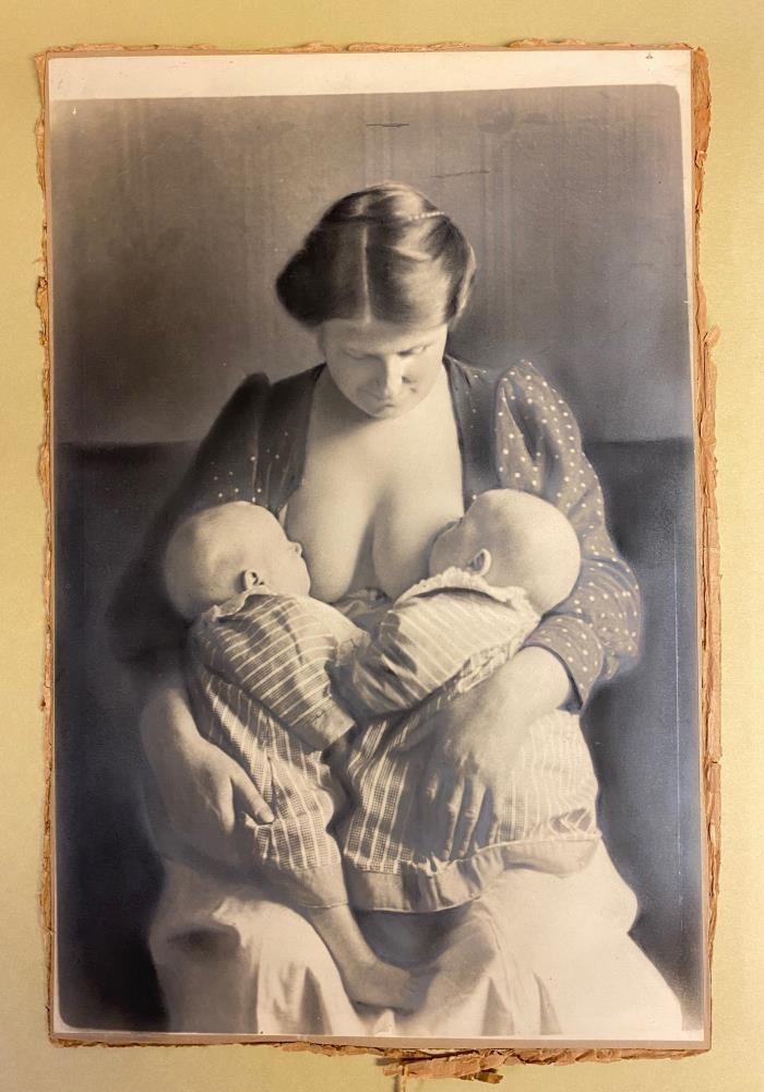 Mynd í ramma. Ljósmynd af konu með tvö börn á brjósti. Guðrún Beck með tvíburasyni sína Símon og Brynjólf fædda 3. des 1915. á fyrsta ári (3 mán). Myndin tekin þar, Þorleifur Þorleifsson tók myndina.