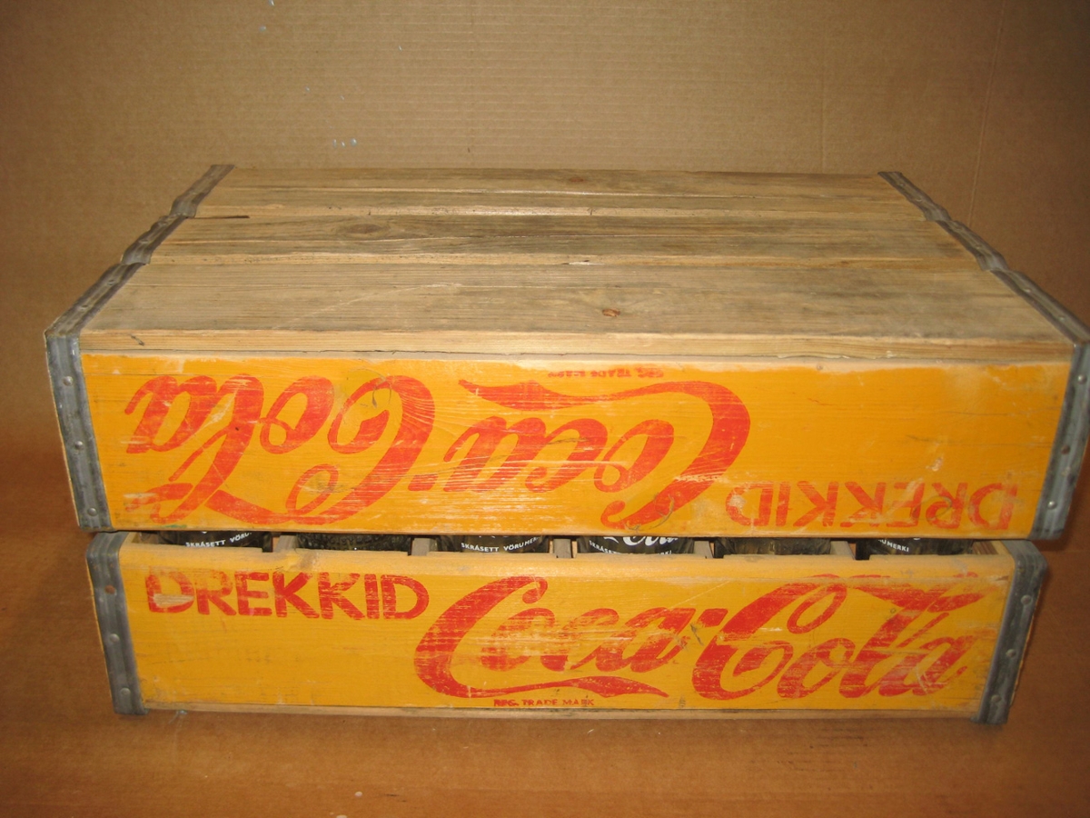 Tveir Coca Cola flöskubakkar með 24 flöskum frá ýmsum tímabilum. Annar bakkinn er undir flöskurnar á meðan hinn er notaður sem lok. Bakkarnir eru úr gulmáluðum við, merktir "DREKKID COCA COLA" með rauðum stöfum. Þeir eru bundnir og negldir saman með tinþynnum og saumum.