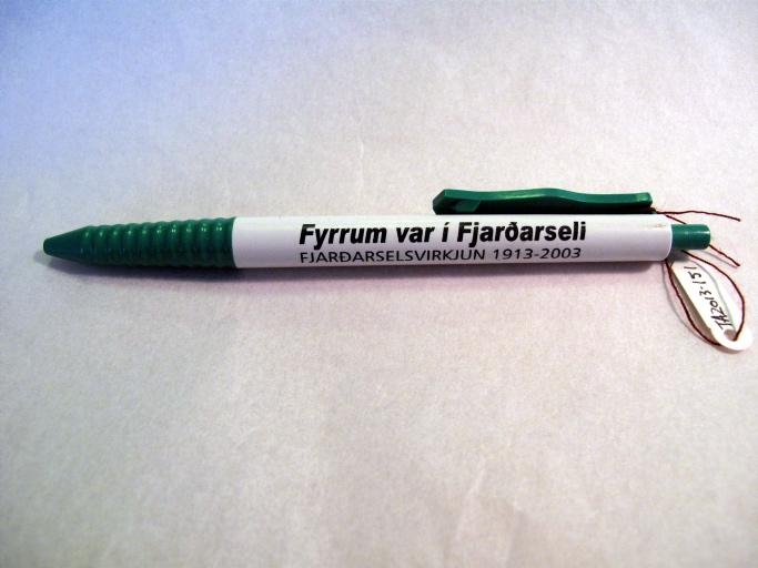 Merktur "Fyrrum var í Fjarðarseli Fjarðarselsvirkjun 1913-2003 ". Grænn og hvítur - blátt blek.