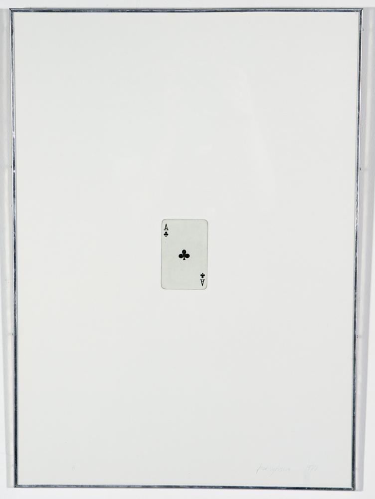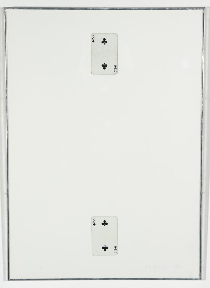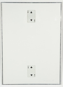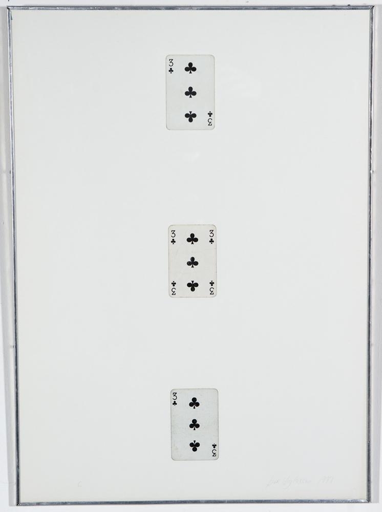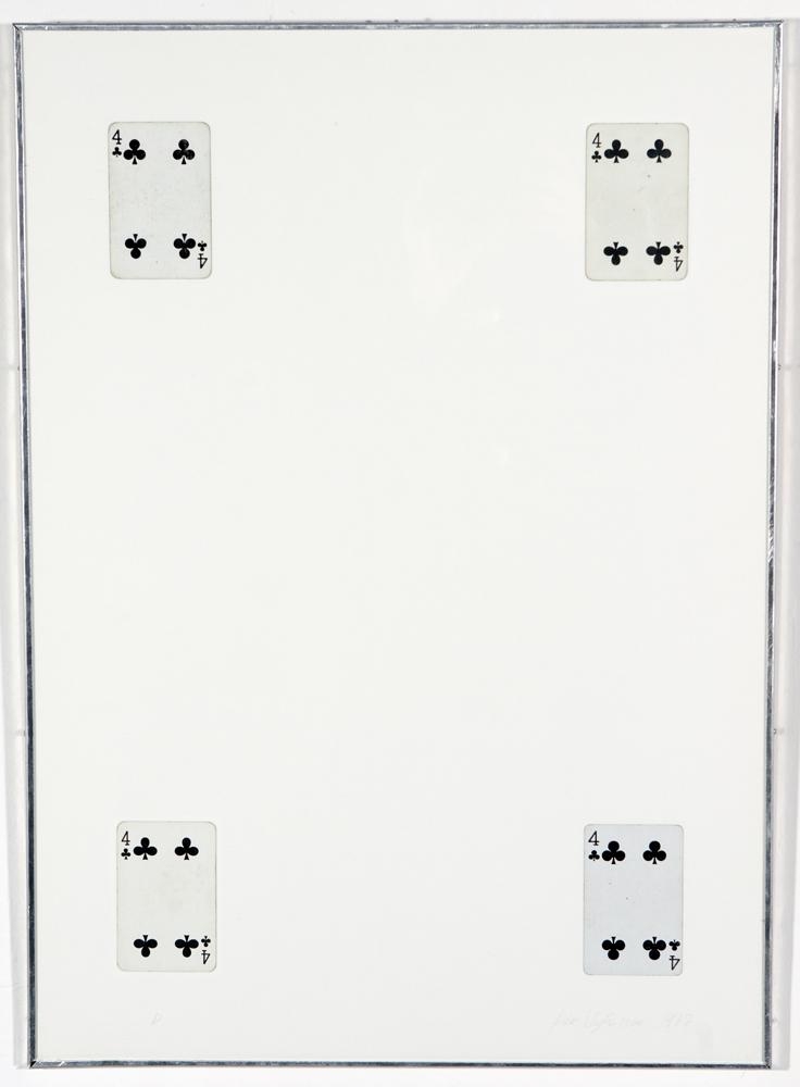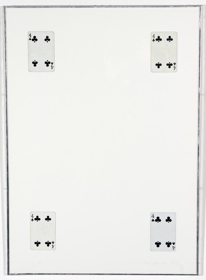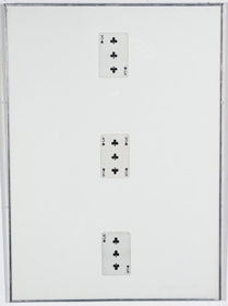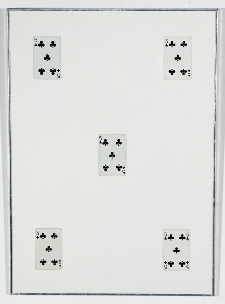 Rammar eru úr áli (heimagerðir?) og með gleri. Eining 1: Eitt spil: laufa ás; límt á hvítt undirlag fyrir miðju: spilið er nokkuð eytt á köntum; virðist hafa verði notað: neðst til vinstri er lauslega skrifaður bókstafurinn A. Bak er mdf-plata. Eining 2: Tvö spil; laufa tvistar: bæði spilin eru staðsett fyrir miðju á hvítu undirlagi; fyrir ofan hvort annað: spilin eru nokkuð eydd á köntum; virðast hafa verði notuð: neðst til vinstri er lauslega skrifaður bókstafurinn B; einnig skrifað á bak og á ramma. Bak er mdf-plata. Eining 3: Þrjú spil; laufa þristar: spilin eru staðsett fyrir miðju á hvítu undirlagi; fyrir ofan hvort annað: spilin eru nokkuð eydd á köntum; virðast hafa verði notuð: neðst til vinstri er lauslega skrifaður bókstafurinn C; einnig skrifað á bak og á ramma. Bak er mdf-plata. Eining 4: Fjögur spil; laufa fjarkar: eitt spil í hverju horni á hvítu undirlagi: spilin eru nokkuð eydd á köntum; virðast hafa verði notuð: neðst til vinstri er lauslega skrifaður bókstafurinn D; einnig skrifað á bak og á ramma. Bak er mdf-plata. Eining 5: Fimm spil; laufa fimmur: spil í hverju horni og eitt í miðju á hvítu undirlagi: spilin eru nokkuð eydd á köntum; virðast hafa verði notuð: neðst til vinstri er lauslega skrifaður bókstafurinn E; einnig skrifað á bak og á ramma. Bak er mdf-plata.