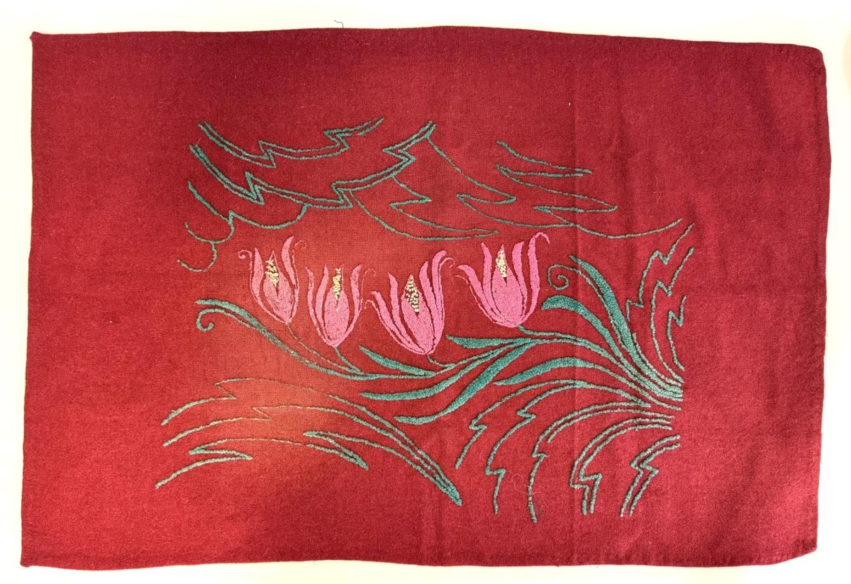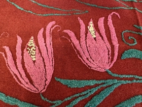 Veggteppi úr rauðu ullarefni, florað með bleikum túlípönum og grænu laufi.