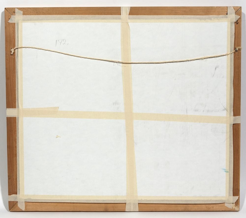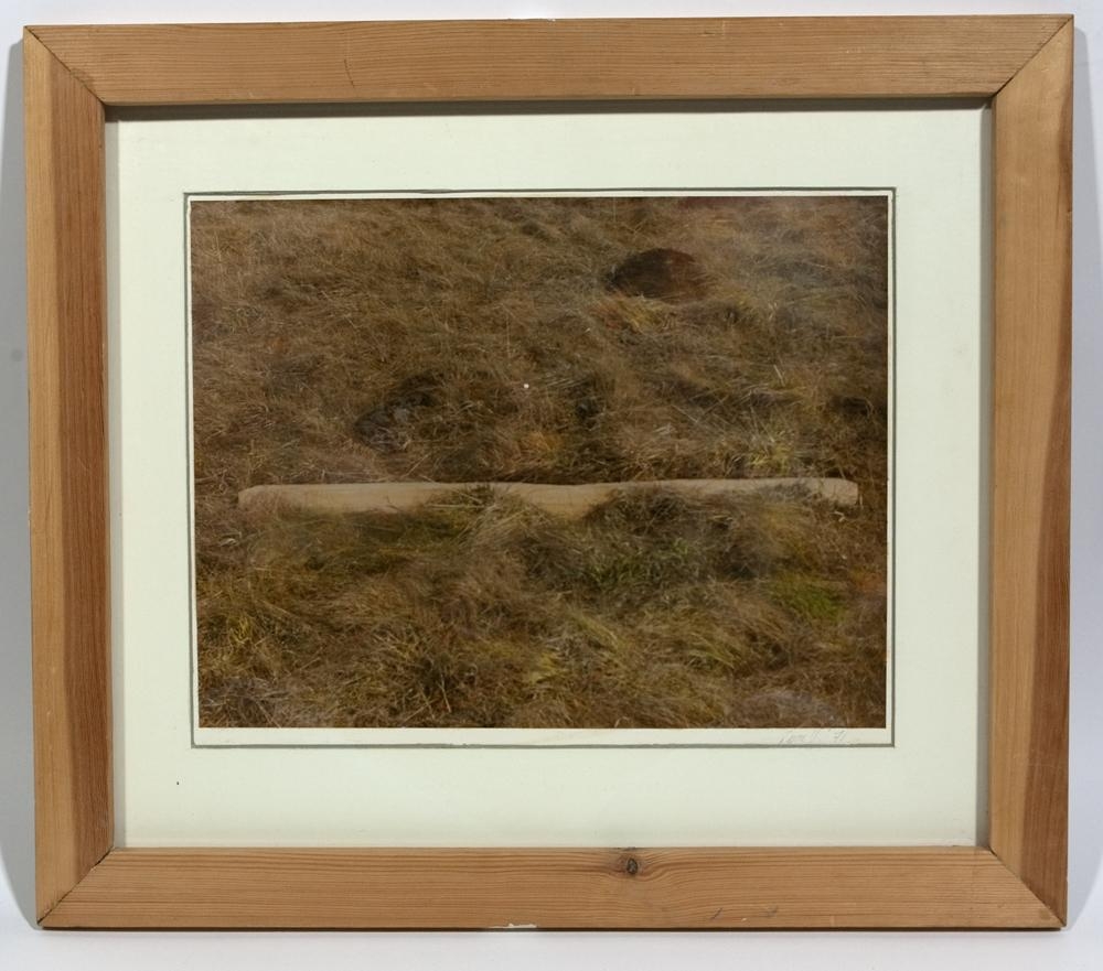 Ljós rekaviður liggur lárétt úti í móa; grasið er gult en er aðeins byrjað að grænka: Rammi ljós og mögulega heimagerðurFölar appelsínugular línur á myndinni - mögulega för eftir framköllunarvökva.