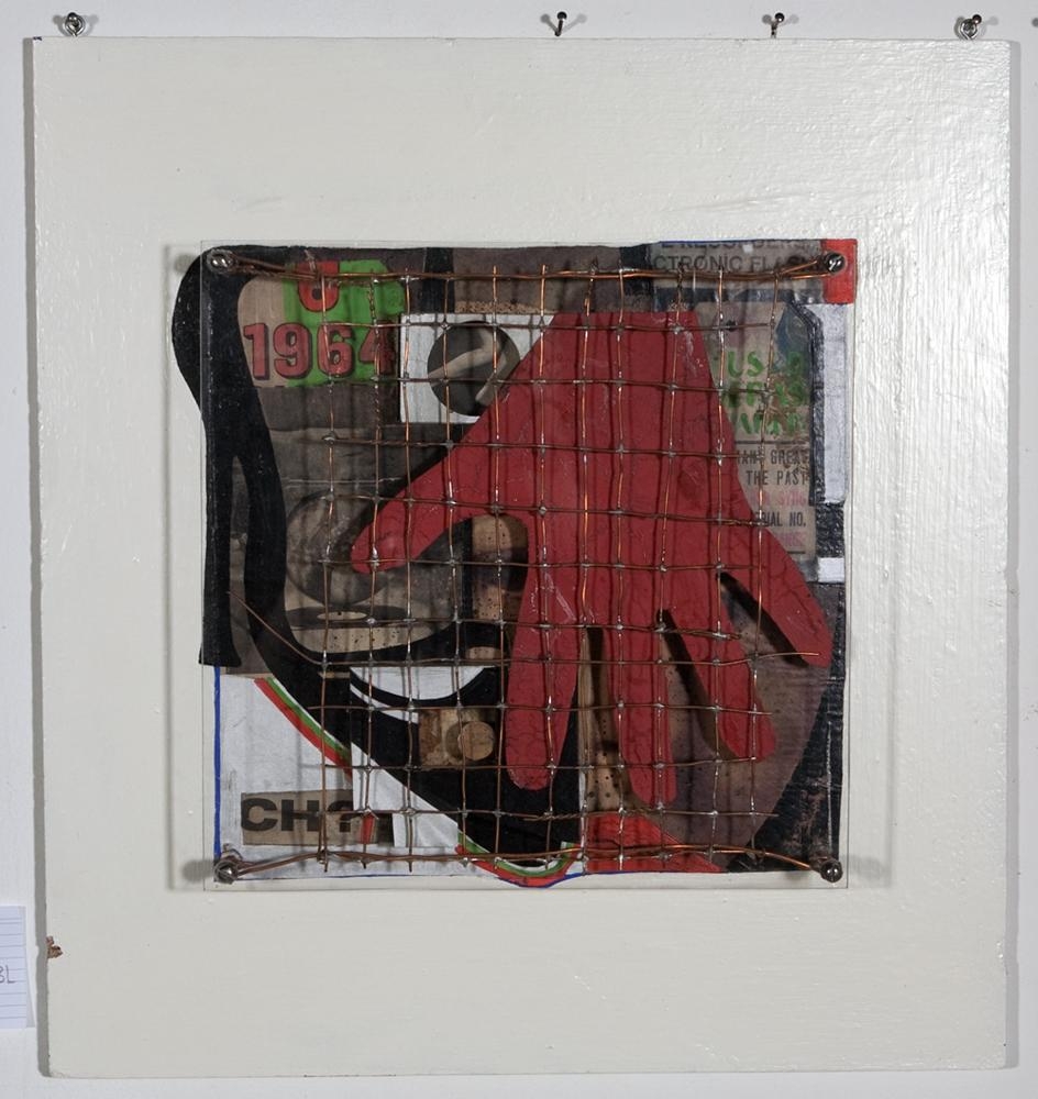Undirlag er hvítlökkuð plata; blaðaúrklippur límdar á undirlagið en einnig er málað á það: Þrívíðir hlutir límdir á undirlagið: rauð sprungin pappírshendi límd á þrívíðu hlutina: gróft málmnet strengt yfir myndina að hluta (heima-lóðað?): Plexíglerplata lögð yfir allt myndefnið.