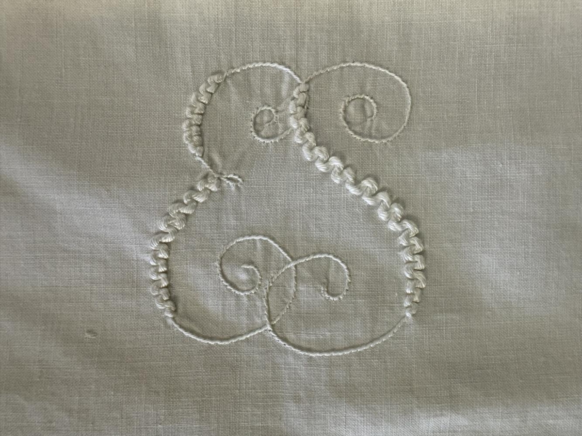 Puntuhandklæði, Útsaumaðir upphafsstafir E.S. Blómamunstur eins og sveigur fyrir miðju.