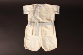 Drengjablússa silkiefni, litur hvítur, ljósblár. Samstæð við nr. 4750. Hneppt til hliðar með belti og stuttum ermum. Brydding á ermum og listi á boðungi eru ljósblá. Hæð 39 cm.