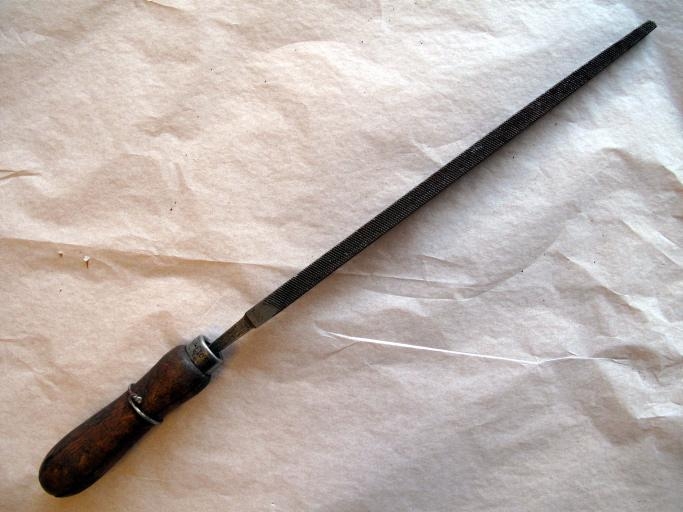 Tvískorinn þjöl. fletir mynda ferning. Handfang rennt úr tré.
