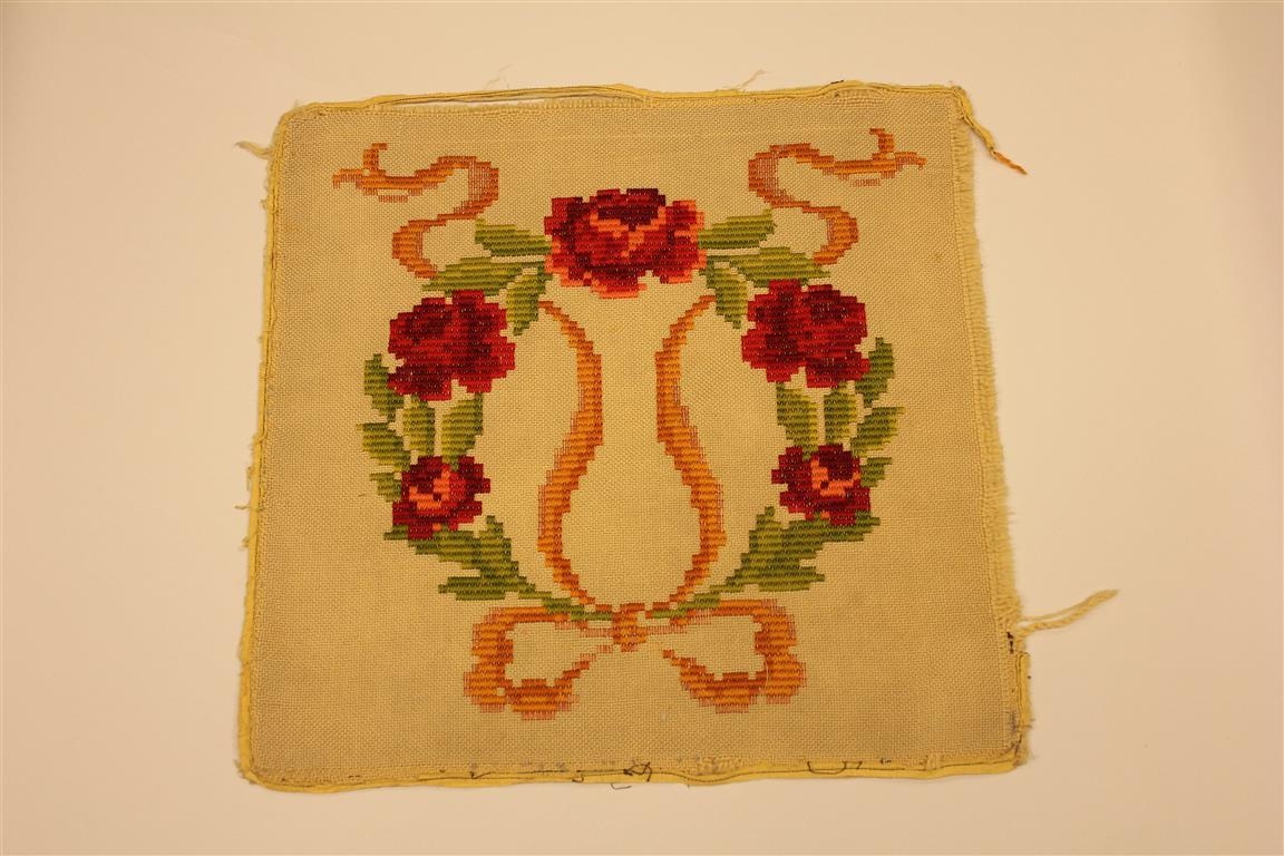 Púðaborð,ullarjafi. Saumað með rauðu, grænu og appelsínulitu ullargarni. Góbelínsaumur, blómakrans með slaufu. Á jöðrum eru leifar af púðabaki eða fóðri.
