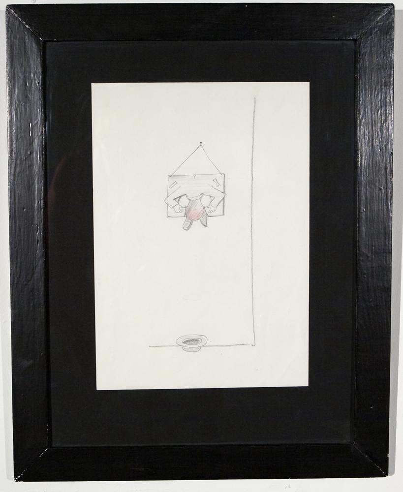 Maður að detta úr ramma sem hengdur er á vegg, fyrir neðan manninn má sjá pípuhatt sem virðist vera hluti af klæðnaði mannsins. Teikning með blýanti; örlítið rauður litur: mynd af manni sem steypist úr ramma; ramminn hengdur á vegg: fyrir neðan rammann má sjá pípuhatt sem virðist vera hluti af klæðnaði mannsinsRamminn er fururammi; málaður svartur: bak úr masoníti: pappi utan um mynd svart