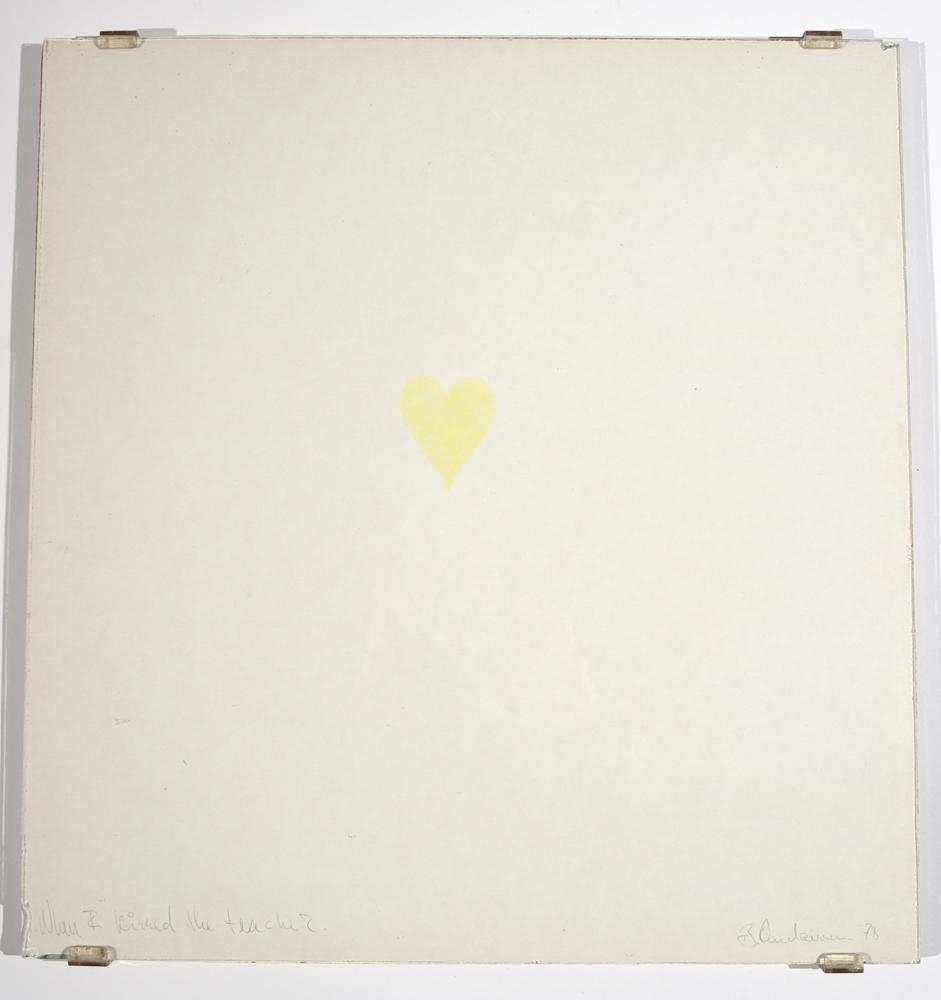 Gult lítið hjarta á miðjum myndfletinum, á ljósan pappír. Rammi gerður úr gleri sem er klemmdur saman við mdf-plötu. Fjórar málmklemmur halda glerinu og plötunni saman. Gler laust.