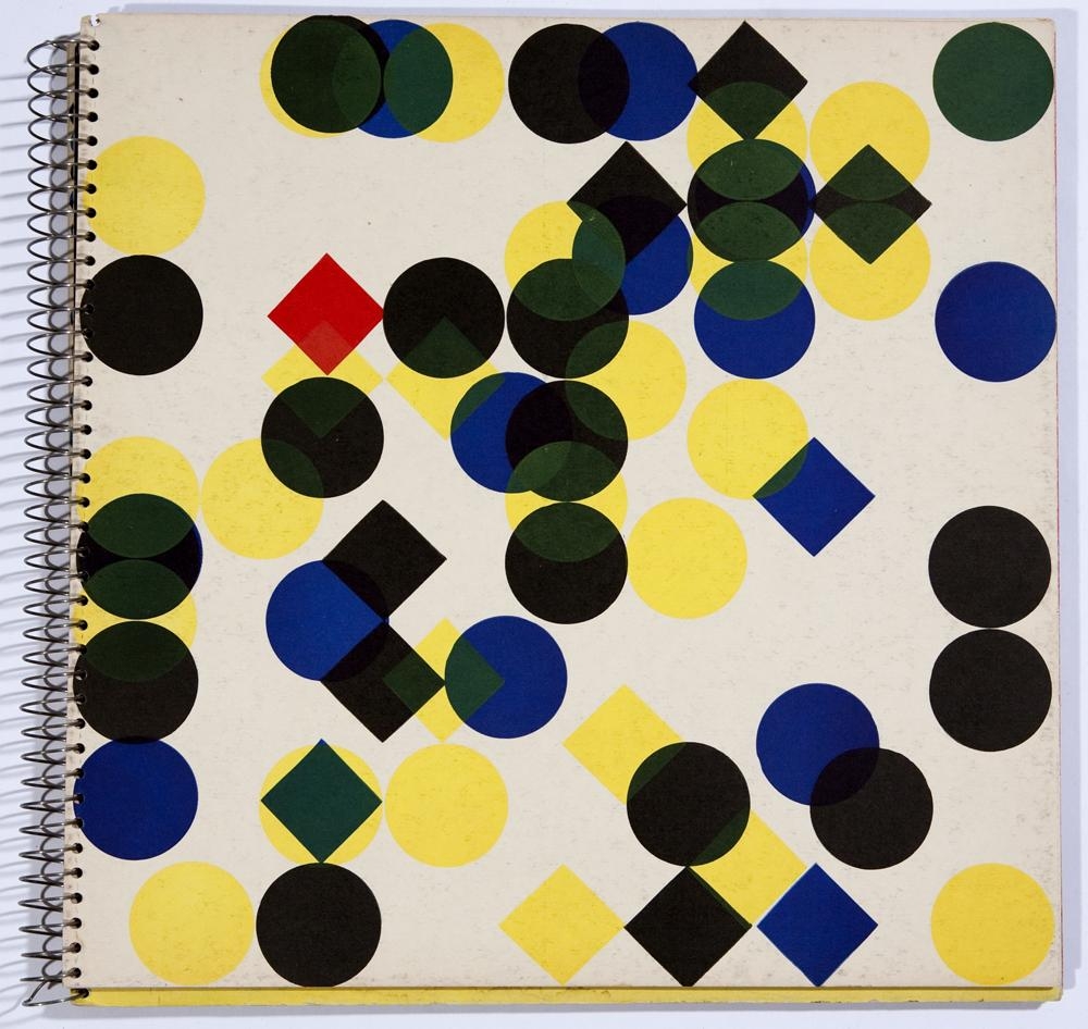 Ferköntuð nokkuð stór bók: bundin inn með málmgormi: innihald er grafísk form í hreinum litum; hringir og kassar.
