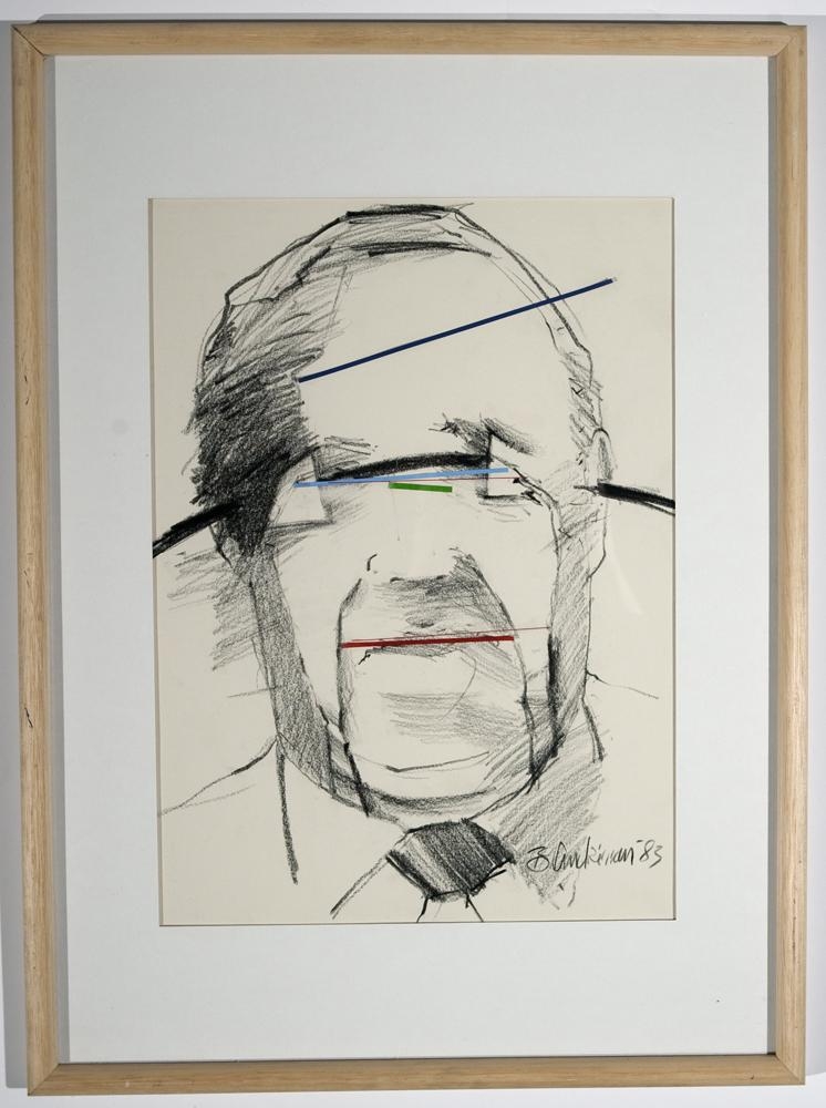 Blýants- eða kolamynd. Portrett mynd af manni, litaðar rendur límdar þvert yfir andlitið á 3 stöðum - m.a. yfir augu mannisns.Ólitaður kúptur fururammi, bak úr bylgjupappa.