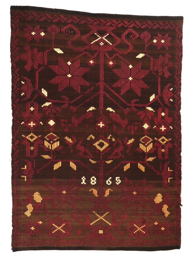 Glitofið söðuláklæði, grunnur svartur, glit í hvítum, gulum, bleikum og fjólubláum litum. Vasi með löngum blómgreinum á hvorum helming, munsturbekkir við brún. Svartur, vaðmálsofinn bómullarborði við brún efst og neðst, handsaumað við röngu. Merkt: 1865.