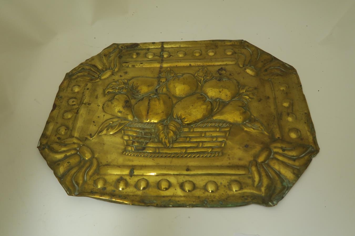 Veggskjöldur úr messing. Skjöldurinn er sexstrendur, pressað er í hann mynstur, karfa með ávöxtum, skrautlisti í kring, blóm á hornum.