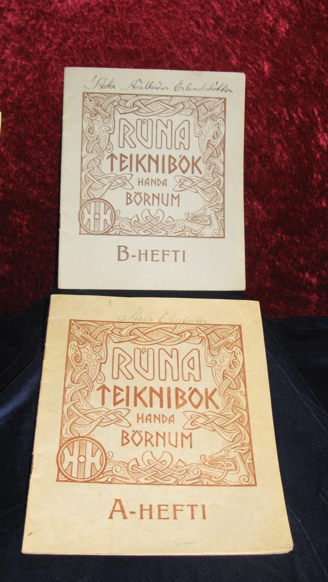 Tvær rúna-teiknibækur handa börnum. A-hefti og B-hefti. Aftan á kápunni stendur "Helgi Hjörvar- Reykjavík". Heftin eru merkt A-hefti Ástu Elísdóttur og Ástu Erlendsdóttur (hefur skrifað sig sitt á hvað). Hvort hefti er 16 blaðsíður og var notað til að kenna börnum að teikna.