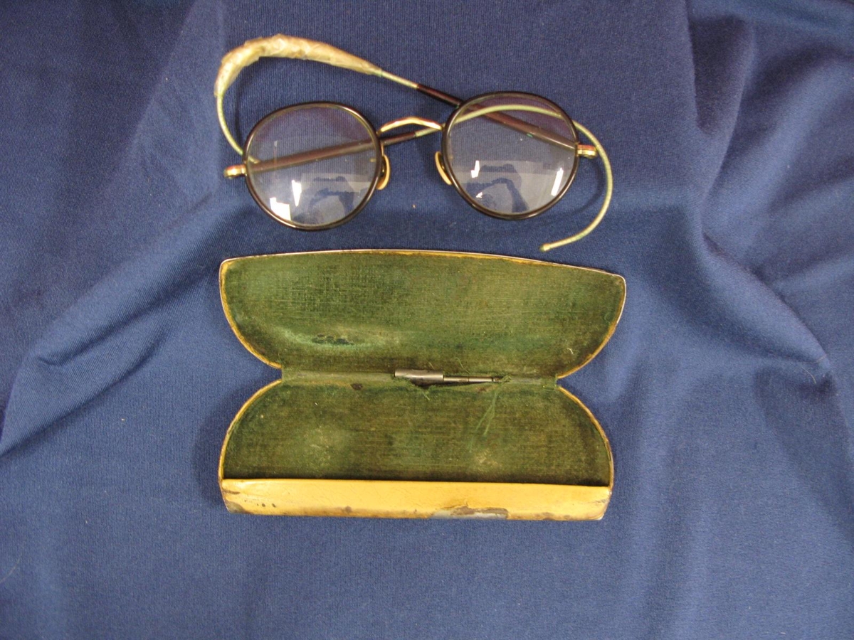 Gömul gleraugu með kringlóttu gleri og svartri plastumgjörð. Spangir eru úr einhverskonar gormum. Hulstrið er ljósbrúnt úr járni en klætt með taui. Að innan er hulstrið klætt með grænu flaueli. Kom úr Hólagerðisbúinu.