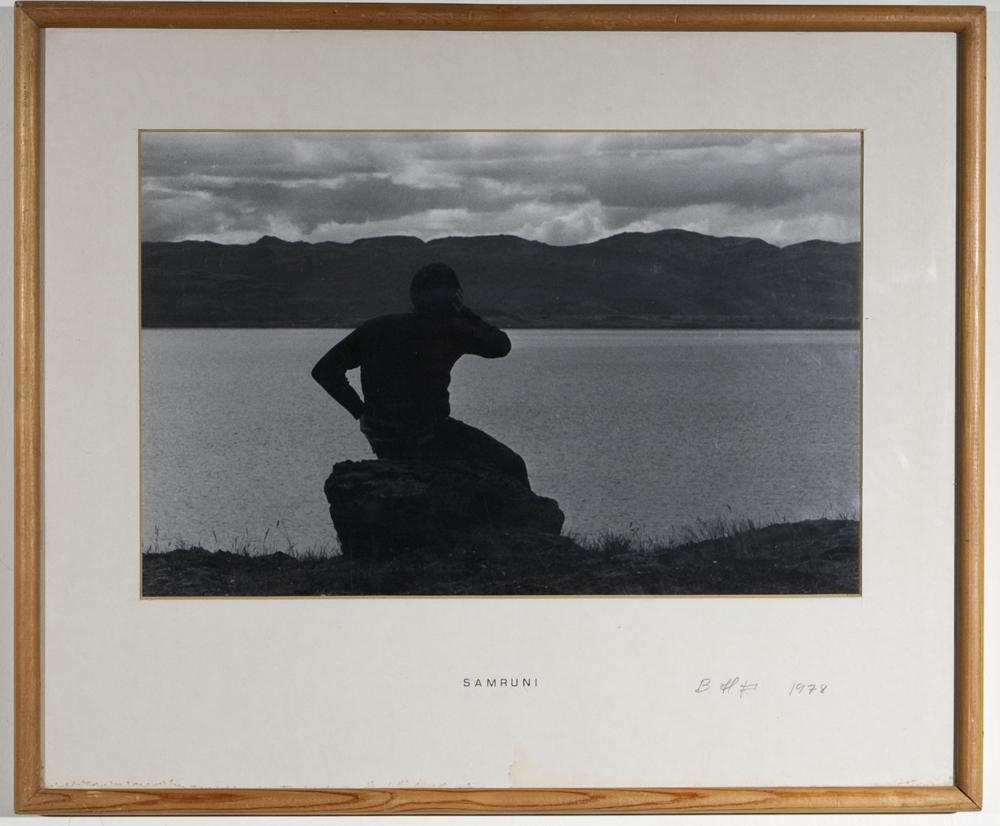Svart/hvít ljósmynd af manni sem situr á steini við vatn (sjóin?) Maðurinn snýr sér að vatninu, þannig að ekiki er andlit hans sýnilegt. Hann setur eina hendina á mjöðmina sína og hina á höfuð sér við eyrað. Í bakgrunni er fjallagarður, hinu meginn við vatnið.Hvítt karton umlykkur myndina sem þó er byrjað að gulna og komnir eru brúnir blettir á neðri síðu.Ramminn er viðarrammi og er með rúnuðum brúnum. Bakið er þykkur brúnn pappír, fremur illa farinn, og er bakið fest á rammann með nöglum.