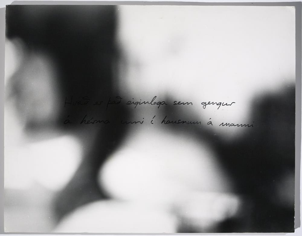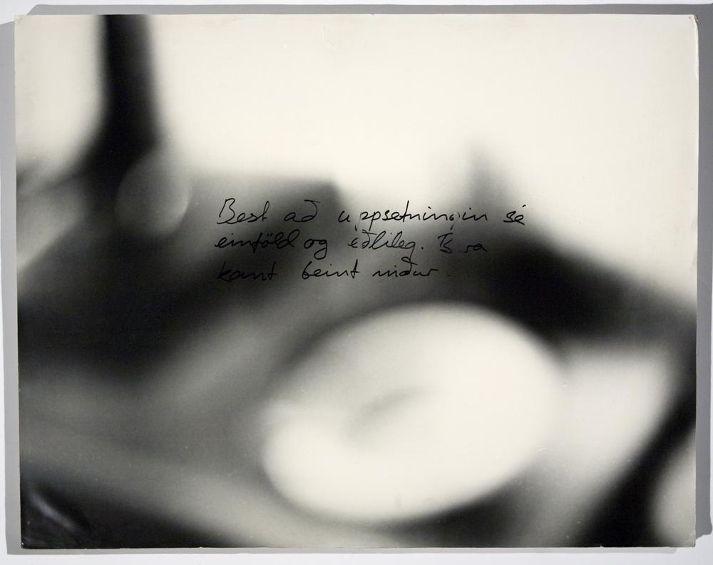 Svört hvít ljósmynd sem er úr fókus og myndar því einungis óljós form. Á miðri myndinni er ritrað með svötrum tússpenna "Best að uppsetningin sé einföld og eðlileg. [Bara kant?] beint niður" (erfitt að lesa úr sumum orðum). Svo virðist sem vanti í setninguna, ummerki er um túss sem hefur strokast út. Ljósmyndin er límd á pónplötu, Á nokkrum stöðum má sjá skemmdir á ljósmyndinni þar sem hún er upphleypt og byrjuð að losna af spónplötunni. Blettir eru á plötunni, líkt sem vatnsskemmdir sem um er að ræða. Verkið er hengt upp á gati sem er í plötunni.