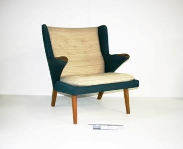 Hægindastóll, bólstraður með íslensku ullaráklæði, bláu og ljósdrapp, sýnilegt trévirki er tekk, en gera má ráð fyrir að grind sé úr furu eða beyki eins og títt var. Stóllinn er teiknaður af Sveini Kjarval og smíðaður í Nývirki h.f.
