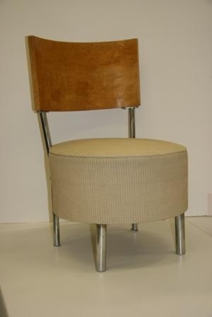 Stóll (1 af 2) með hringlaga setu bólstraðri með ljósu ullaráklæði, bogadregið bak, spónlagt með birki. Hluti af svefnherbergissetti,sem hannað er af Einari Sveinssyni (1906-1973) húsameistara Reykjavíkur fyrir hann og konu hans Vigdísar (Stellu) Reykdal (1911-1995), sennilega fyrir 1940. Í settinu eru 8 einingar: Rúm, snyrtiborð, spegill, klæðaskápur og tveir stólar ásamt 2 nátttboðum. Allt er spónlagt með "fuglsauga birkispæni". Framleiðandi er ókunnur.