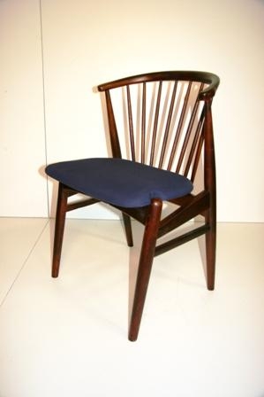Borðstofustóll, smíðaður úr beyki með krossviðarsetu og pílárum í baki. Setan klædd með djúpbláu ullaráklæði. Sýnilegt trévirki er bæsað með dökkbrúnni viðarbæs og lakkað.