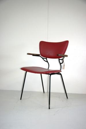 Sindrastóllinn. Stálstóll með tekk eða eikarörmum Ýmist klæddur með íslensku ullaráklæði eða galoni (leðurlíki ). Þetta eintak er klætt rauðu upprunalega galon áklæði. Stóllinn er teiknaður af Sveini Kjarval og í framleiðslu hjá Sindra h.f. frá 1957 eða 1958 og var sýndur á norrænu hönnunarsýningunni " FORMES SCANDINAVES " í París 1958-59. Sjá skýringar við Nr. 2000-77-1-7.