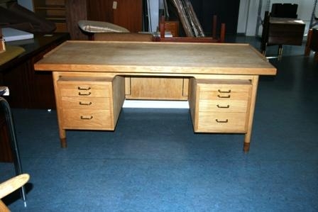 Skrifborð úr ljósri eik. Neðan á renndum löppum eru koparhulsur, sem hönnuðurinn Sveinn Kjarval notaði mikið í verkum sínum. Skrifborðið er sérhannað og smíðað fyrir Pétur Guðmundsson, fyrrverandi flugvallarstjóra á Keflavíkurflugvelli.
