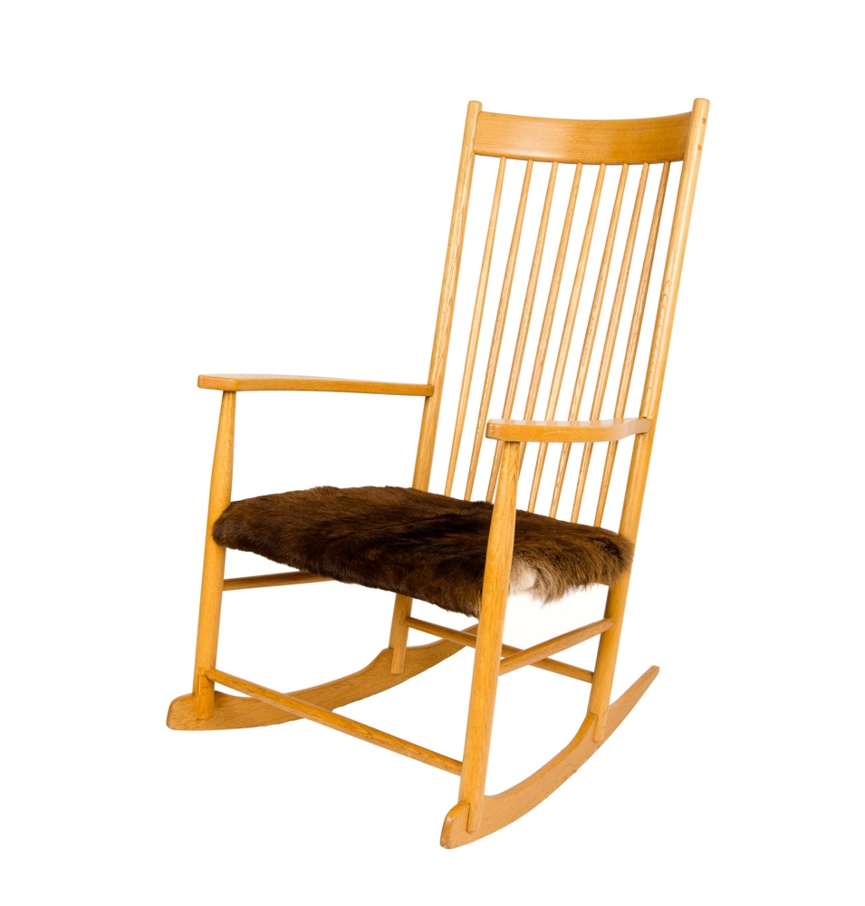 Ruggustóll úr eik, pílárar í baki en setan er klædd með hrosshúð. Framleiðsla á þessum vinsæla ruggustól á sjöunda áratugnum var mikilvægur þáttur í starfsemi verkstæðisins Nývirkis (st.1955). Mikil eftirspurn var eftir ruggustólnum og talið er að framleiðslan hafi skipt hundruðum. Setan var ýmist klædd skinni eða ullaráklæði.