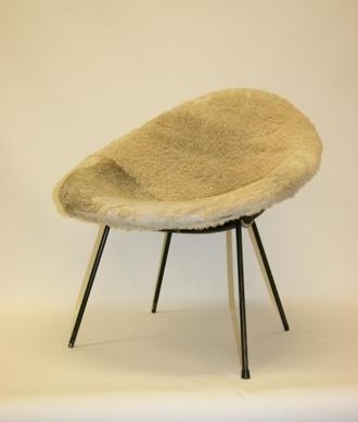 Stóll, skel úr trefjaplasti sem formað er yfir mót, ( trémót, stálmót eða gipsmót ), með svokallaðri handaðferð, á dönsku ( håndoplægningsmetode ), lag eftir lag lagt yfir mótið í bindiefni, epoxy, þangað til hæfilegum styrk er náð í skelina. Skelin er síðan klædd með svampi og yfirdekkt með viðeigandi áklæð í þessu tilfelli gæruskinni. Fætur úr stálteinum með " koparskó " Stólar þessarar gerðar voru framleiddir í nokkrum mæli hjá Sindra hf. við Hverfisgötu í Reykjavík. Höfundur talinn Ásgeir Einarsson forstjóri.