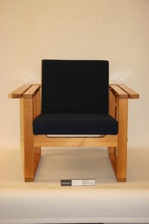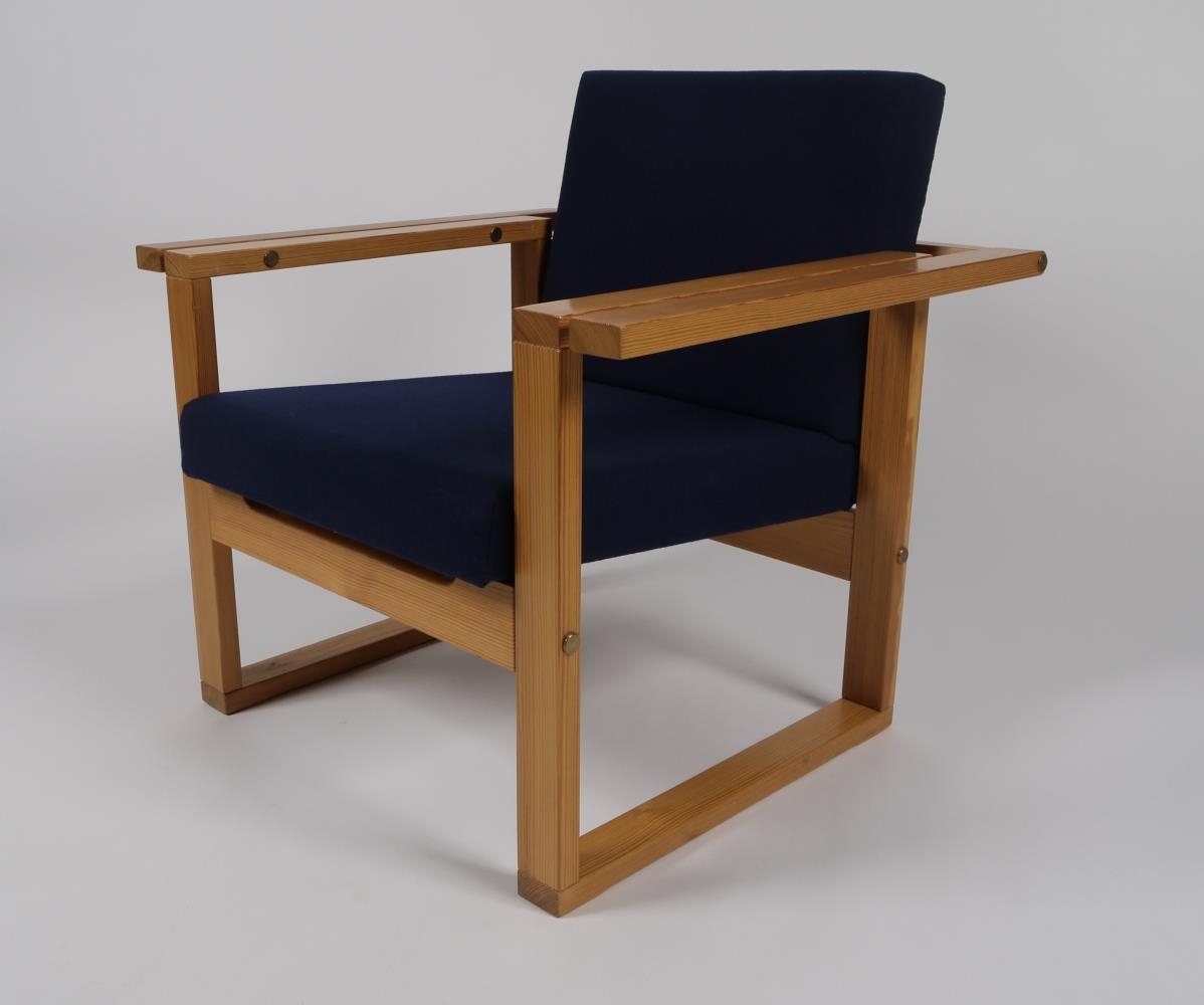 Hægindastóll "Inka" framleiddur af Nývirki ehf. 1963. Fura og blátt ullaráklæði.