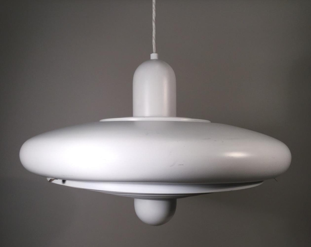 Stór hvítur hengilampi, smíðaður úr dregnu áli, form lampans dregin úr álplötu yfir stálmót.