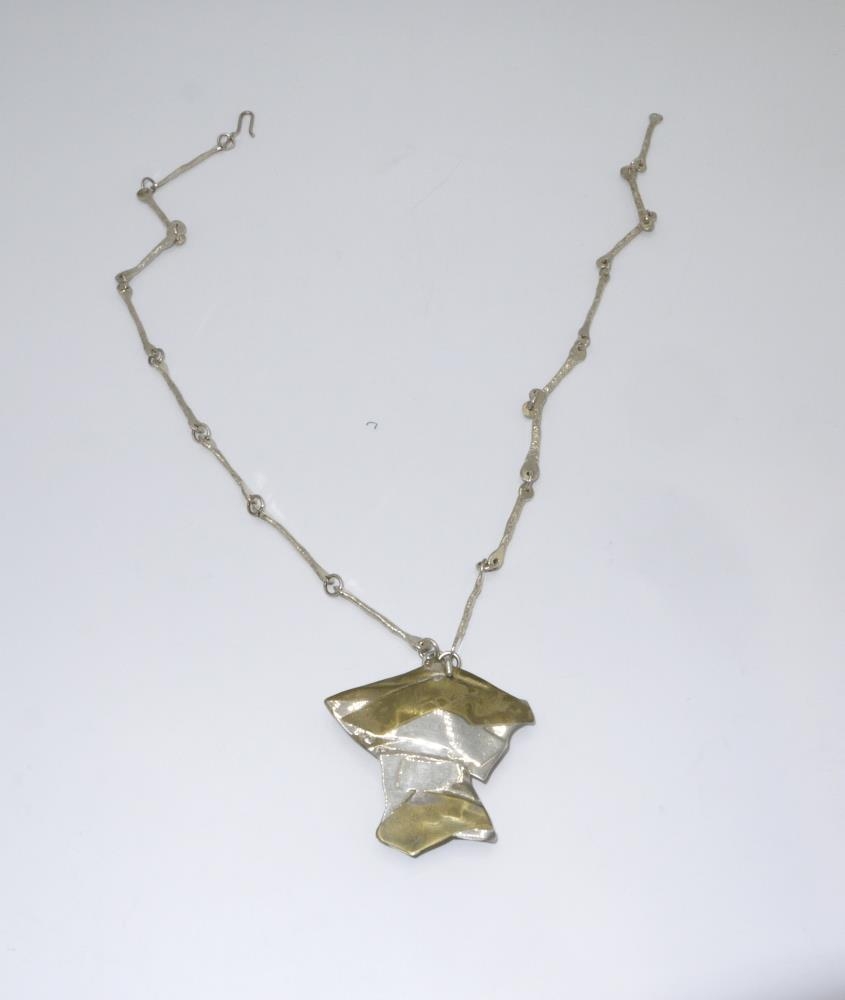 Óreglulega lagað hálsmen úr silfri, mismunandi lagaðir silfurbútar (koparslegið) formaðir á silfurgrind, með keðju sem er samsett úr 16 hlekkjum úr silfri, með silfurstimpli Jens og stimplað Hanna, Hansína Jensdóttir (f. 1954) gullsmiður. Keypt hjá Jens1987 og var gjöf til Lilju Hallgrímsdóttur frá nokkrum vinum í tilefni fimmtugsafmælis 18. mars 1987. Hálsmenið var í gjöf Árna St. Norðfjörð og konu hans Lilju Hallgrímsdóttur til Hönnunarsafnsins í febrúar 2008. Stærð: H. 5 cm; Br. 3-5 cm; Keðja: L. 16 hlekkir x L. 3 cm.