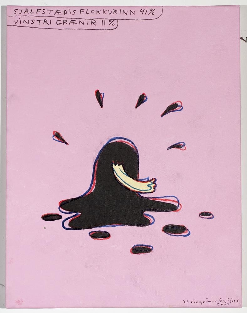 Fígúrutíft verk. Svört fígúra með gular hendur, útlínur fígúrunnar eru bláar og rauður, sennilega gerðar með túss. Dropar virðast koma frá fígúrunni, bæði fyrir ofan hana og neðan. Bakgrunnur er bleikur. Strigi er strektur á blindramma.