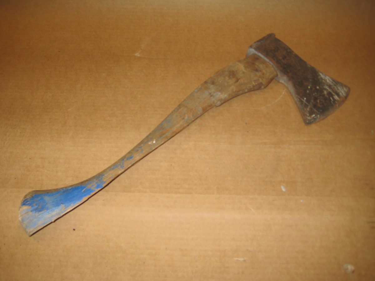 Steinöxi þar sem viðarskaft er klofið langsum. Skaftið hefur verið málað blátt, sennilega til að merkja það eiganda sínum.