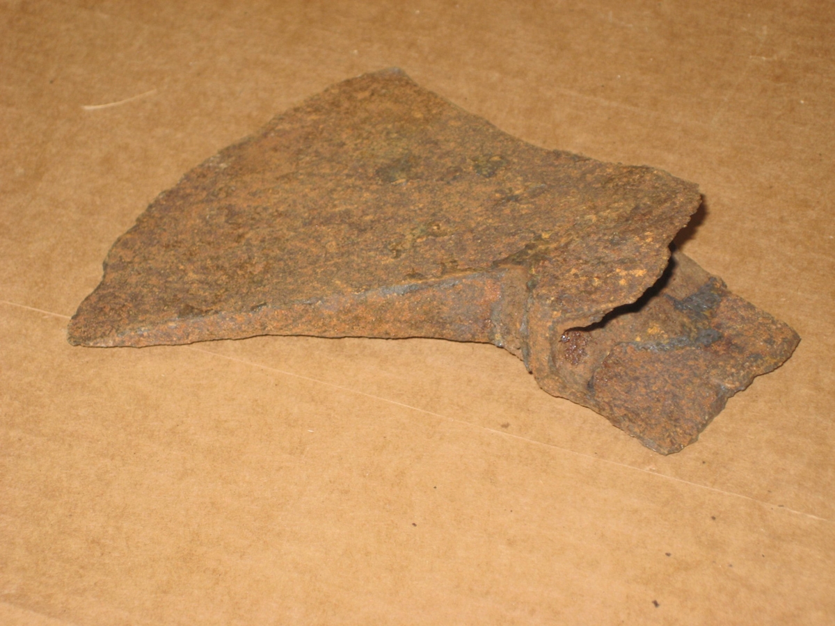 Auga fyrir axarskaft brotið. Öxin er vel ryðguð.